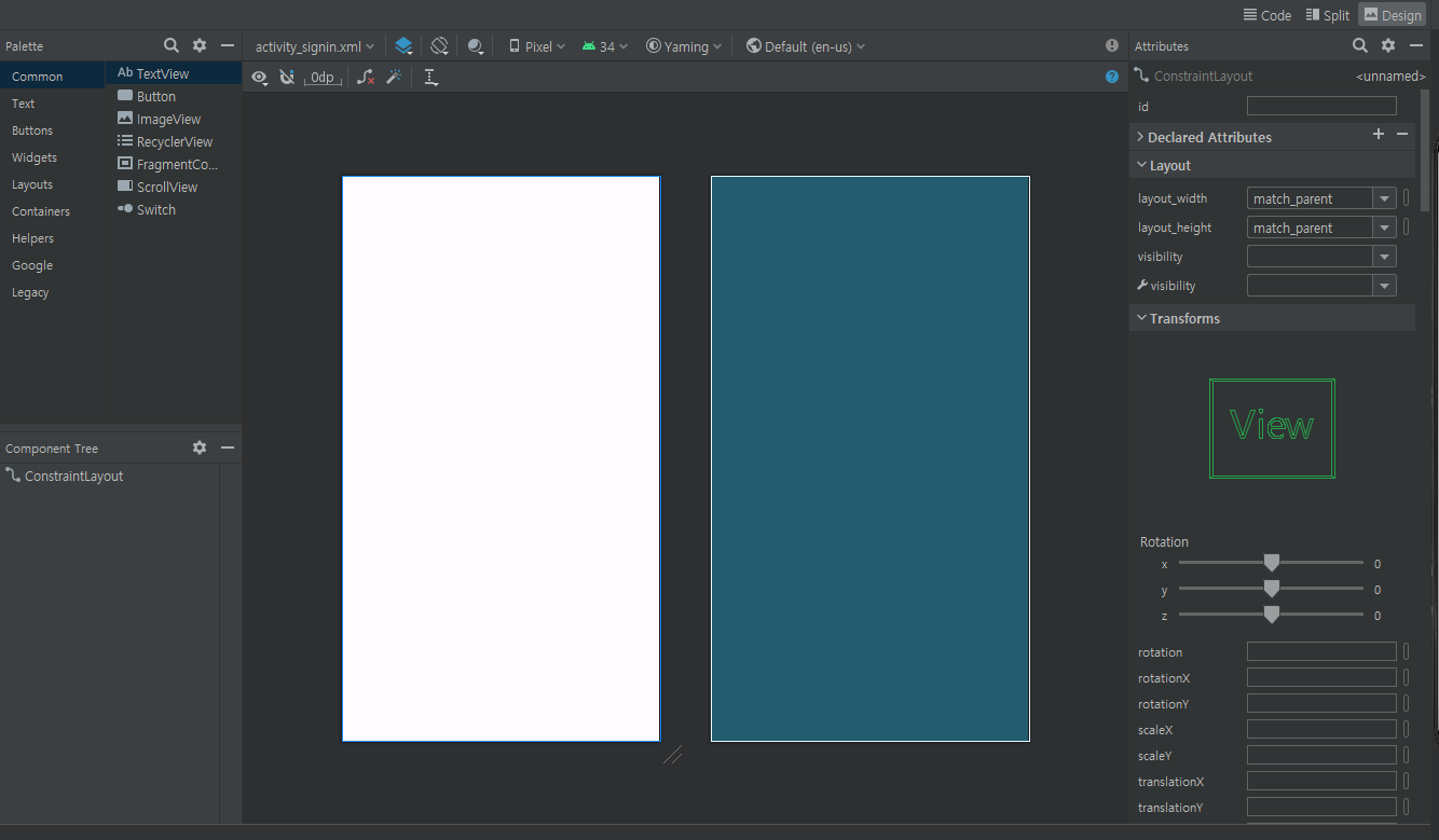 위와 같이 xml파일의 디자인 탭에서 화면의 UI를 구성할 수 있다.