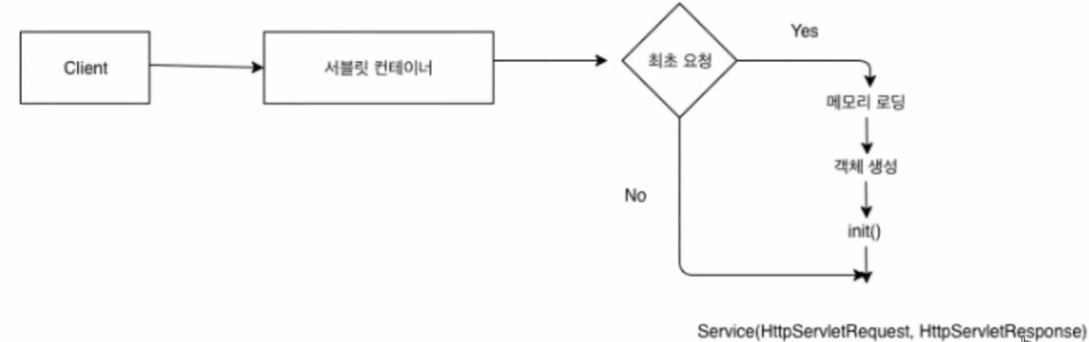request(자바 자원일 경우) → 서블릿 컨테이너 호출 → 서블릿 객체 생성(new) → init() → service() → Get(), Post(), ...