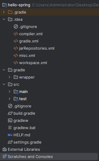 위 사진에서 .idea는 IntelliJ가 사용하는 설정 파일이다. gradle는 gradle관련된 폴더이다. src는 main과 test가 있는데 main이하에는 자바와 resources파일이 있고 test는 테스트코드와 관련된 소스코드들이 들어간다. 최근 개발 트랜드에서는 테스트 코드의 중요도가 높아지기 때문에 src내에서도 따로 나눠 놓은 것을 볼 수 있다.