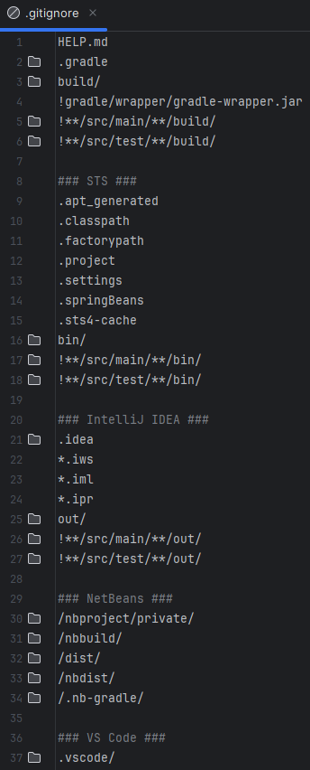 .gitignore는 형상관리 관련 무시 설정으로 볼 수 있는데 Gitjub에는 꼭 필요한 소스코드만 올라가야하고 빌드 결과물 등은 올라가면 안되기 때문에 무시해야될 항목들을 최초 설정했던 사이트(https://start.spring.io/)에서 모든것을 작성하여 넣어준 것을 볼 수 있다.