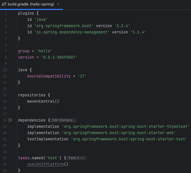 bulid.gradle의 코드이다. 버전 설정과 라이브러리를 가져오는 역할을 한다. dependencies에는 https://start.spring.io/ 에서 추가 했던 라이브러리들이 들어가 있다. testImplementation은 기본적인 테스트 라이브러리가 기본적으로 들어간다.