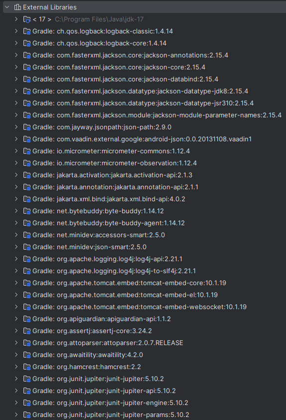 IntelliJ의 Gradle를 확인해보면 내가 추가한 라이브러리와 그 라이브러리와 의존관계에 있는 모든 라이브러리 들을 확인할 수 있다.