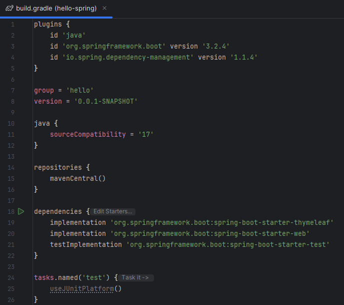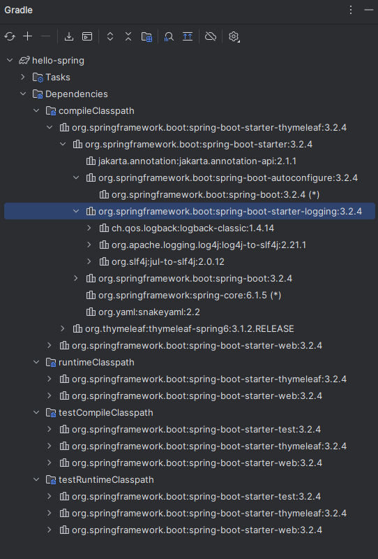 External Libraries을 확인해보면, apache, tomcat, xml, junit 등 직접적으로 추가하지 않은 라이브러리들도 불러와진다. Gradle과 Maven 같은 빌드 툴들은 의존관계를 다 관리해주기 때문에 직접 추가했던 라이브러리인 spring web과 thymeleaf에 의존관계가 있는 모든 라이브러리를 자동적으로 추가해준 모습이다.